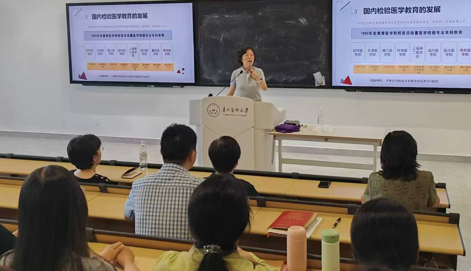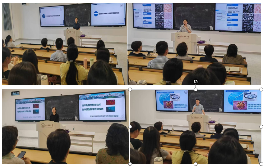 副经理费樱通过介绍教育部对医学检验技术专业员工的培养要求、详细阐述了大学期间的专业课程设置以及实习和毕业的基本要求。随后,临床检验学教研室主任谢婷婷、临床微生物与免疫学教研室主任余芳、临床生物化学与分子生物学教研室主任韦四喜先后从研究内容、教学目标、临床意义等方面介绍了各门专业课程的具体情况。