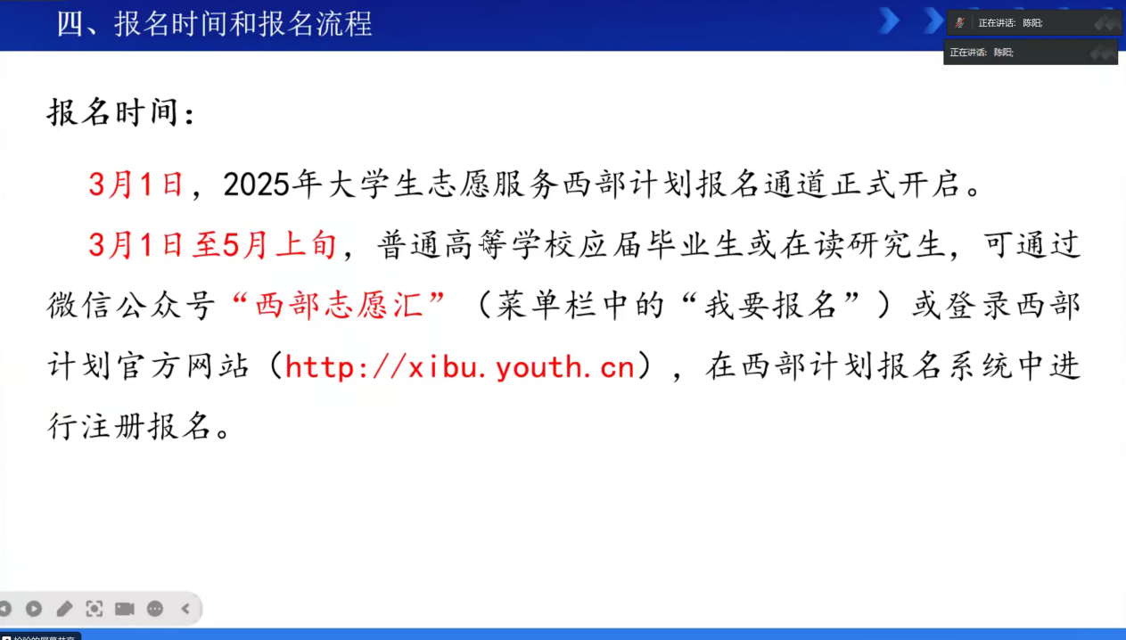 随后,陈阳老师围绕“是什么、做什么、如何参与、有何保障”四大板块,详细介绍了西部计划服务内容、报名时间与流程、相关待遇和优惠政策等,并从“国家战略需求”与“个人成长机遇”方面鼓励毕业生踊跃报名,珍惜“突破‘小我’、成就‘大我’”的人生机遇,在祖国需要的地方发光发热。最后互动答疑环节,苏曦与陈阳两位老师针对员工提出的问题一一解疑答惑。