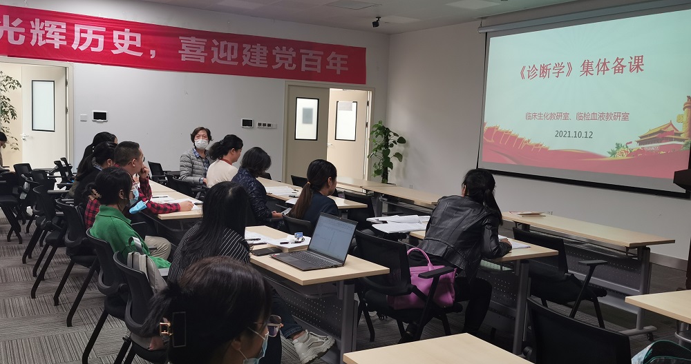 为了进一步提高临床专业员工执业医团队格考试通过率,进一步改进《诊断学》教学质量,拓宽教学思路,临床基础与血液教研室与临床生化教研室于2021年10月12日下午14:00在临床检验中心六楼会议室开展联合集体备课活动。活动由临床生化教研室主任马莉老师主持,临床基础与血液教研室主任刘咏梅和两个教研室授课老师20余人参加活动;本次活动旨在探讨教学方法,相互借鉴、相互启发,增强课堂效果、提高教学水平。