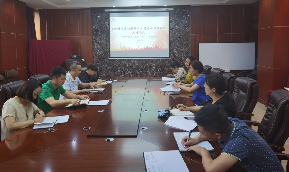 《新时代高校教师职业行为十项准则》上墙,教学科研管理科副科长王世君领读,准则中的禁行性规定是底线,是教师不可触碰的红线,也是一份“预防保健手册”,是对广大教师的警示提醒和严管厚爱。