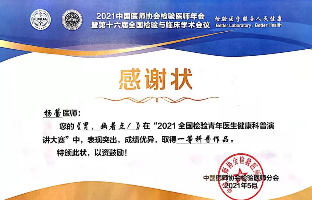 大会组委会收到来自全国各省(自治区、直辖市)的检验青年医生健康科普演讲参赛视频150余份,经组织严格评审,共评选出18个优秀视频。公司304永利集团教师杨蕾入围决赛并进行现场角逐,以优秀的成绩喜获一等科普作品。