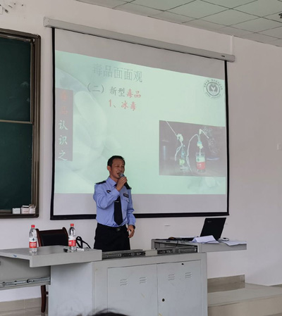 龙竹星警长给同学们介绍了毒品的种类,用很多真实的案例讲述了毒品对个人、对家人和对社会的危害性。他倡导大家坚持科学的生活方式,在日常生活中谨慎交友、不与社会闲杂人员来往,自觉抵制毒品,远离毒品。最后,莫非教授代表所有老师及同学感谢了龙竹星警长为我们带来的精彩报告,告诫同学们一定要洁身自好,珍惜自己的青春,树立起正确的人生观、价值观和世界观,努力学习,健康成长,为社会作贡献。